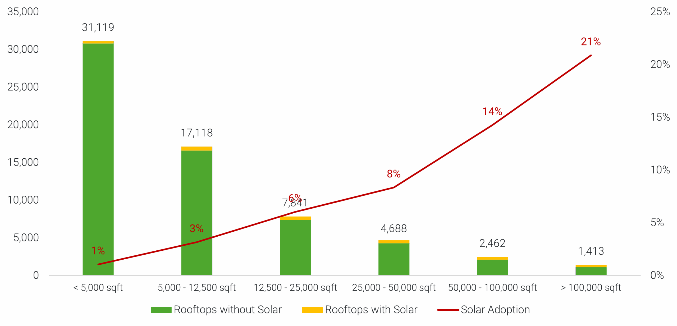 Mid-sized rooftops (12,500–50,000 sqft) — often retail anchors, light industrial buildings and distribution centres — show slightly higher adoption but significant remaining gaps.